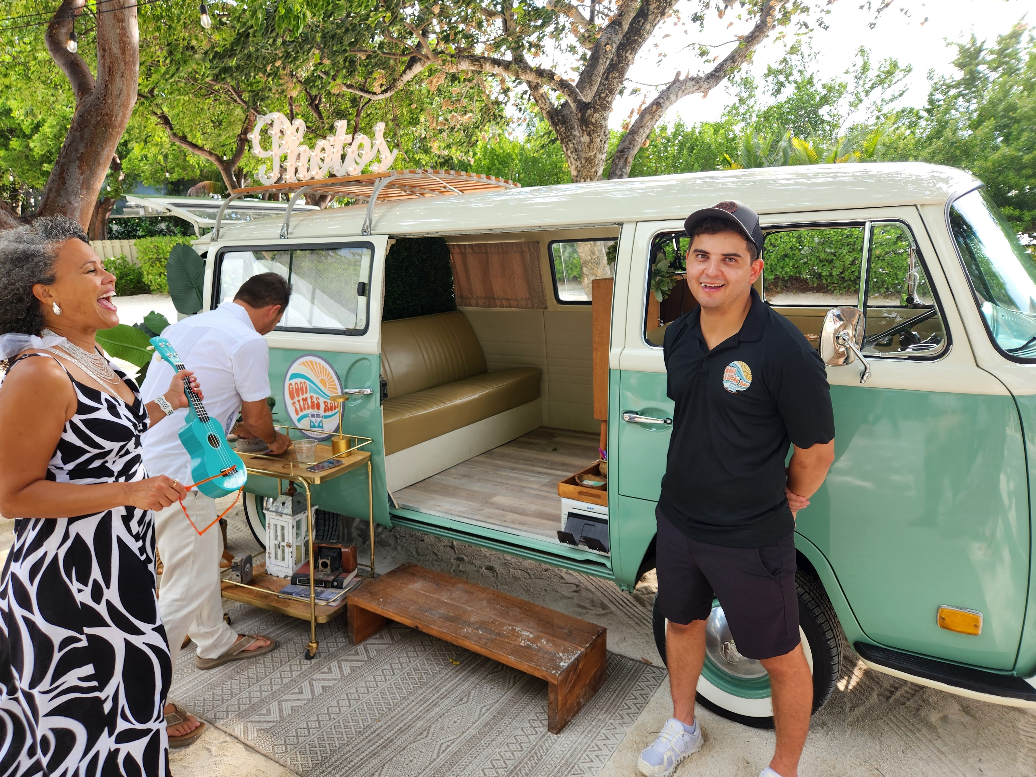 Scott and I were tickled to see that they had a photobooth, and not just any photobooth, but a fully restored 70’s model Volkswagen bus that was stocked full of all sorts of over the top accessories and props. We made a beeline to it, picked out our kitschy attire from the selection, and hopped in for the first of three sessions. Not to brag, but we are basically photobooth experts and take ridiculously ridiculous pictures and love every minute. (Fun fact, Scott is using the picture below with me cropped out as his work profile picture now and I think someone has commented on it in every single meeting this week- it has created many laughs and is so incredibly on-brand for him.)