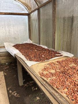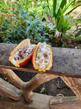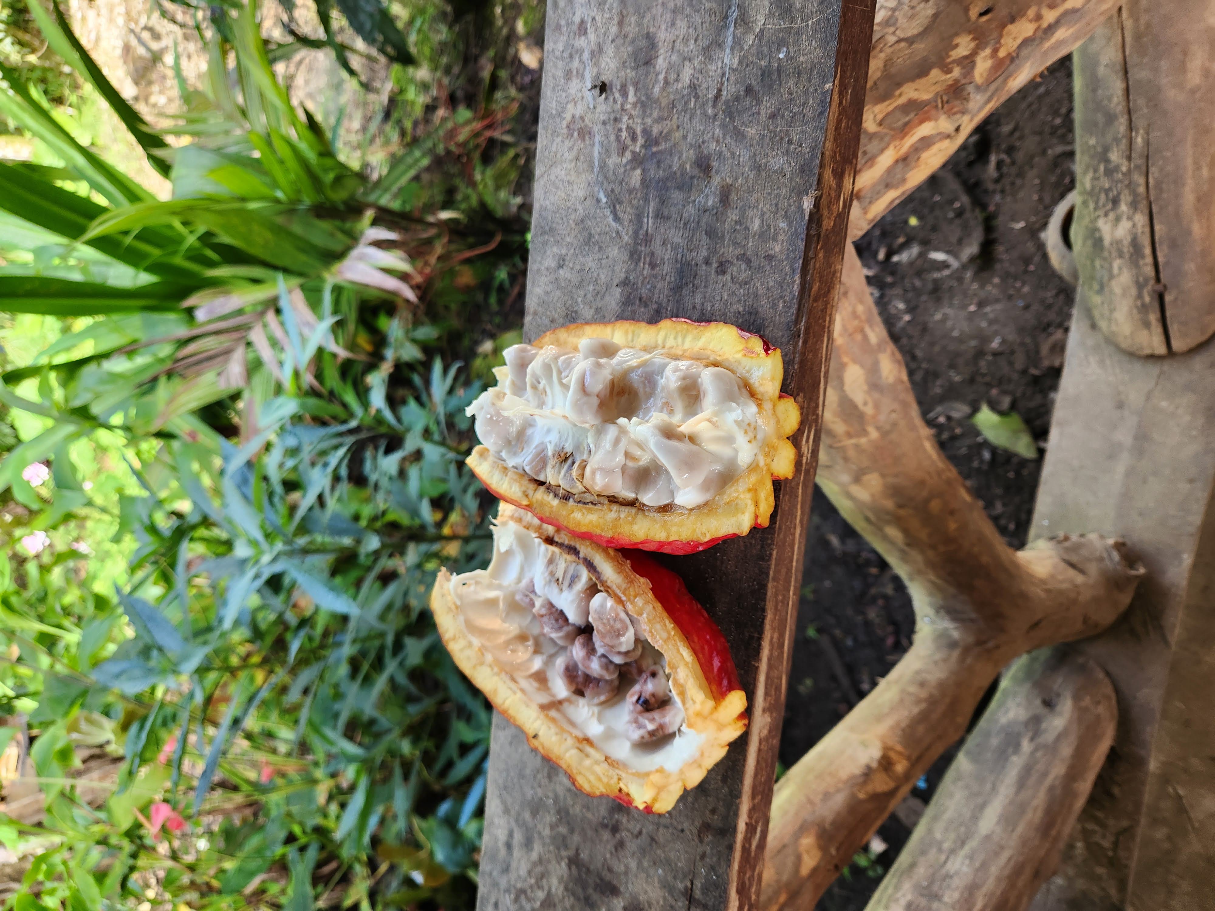 When we arrived, Carlos took us around the cacao orchard and we plucked off a few of the football sized bright red pods that were ripe and ready to be picked. He cut into one of them and had us sample the white pulpy seeds. They tasted literally nothing like chocolate, and instead had a tangy and almost citrusy or mango-like taste. We were instructed to eat the flesh but not the hard beans inside and to spit that part out and keep it. These beans go on to be laid out to ferment and dry for several days.