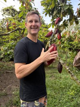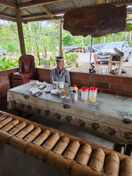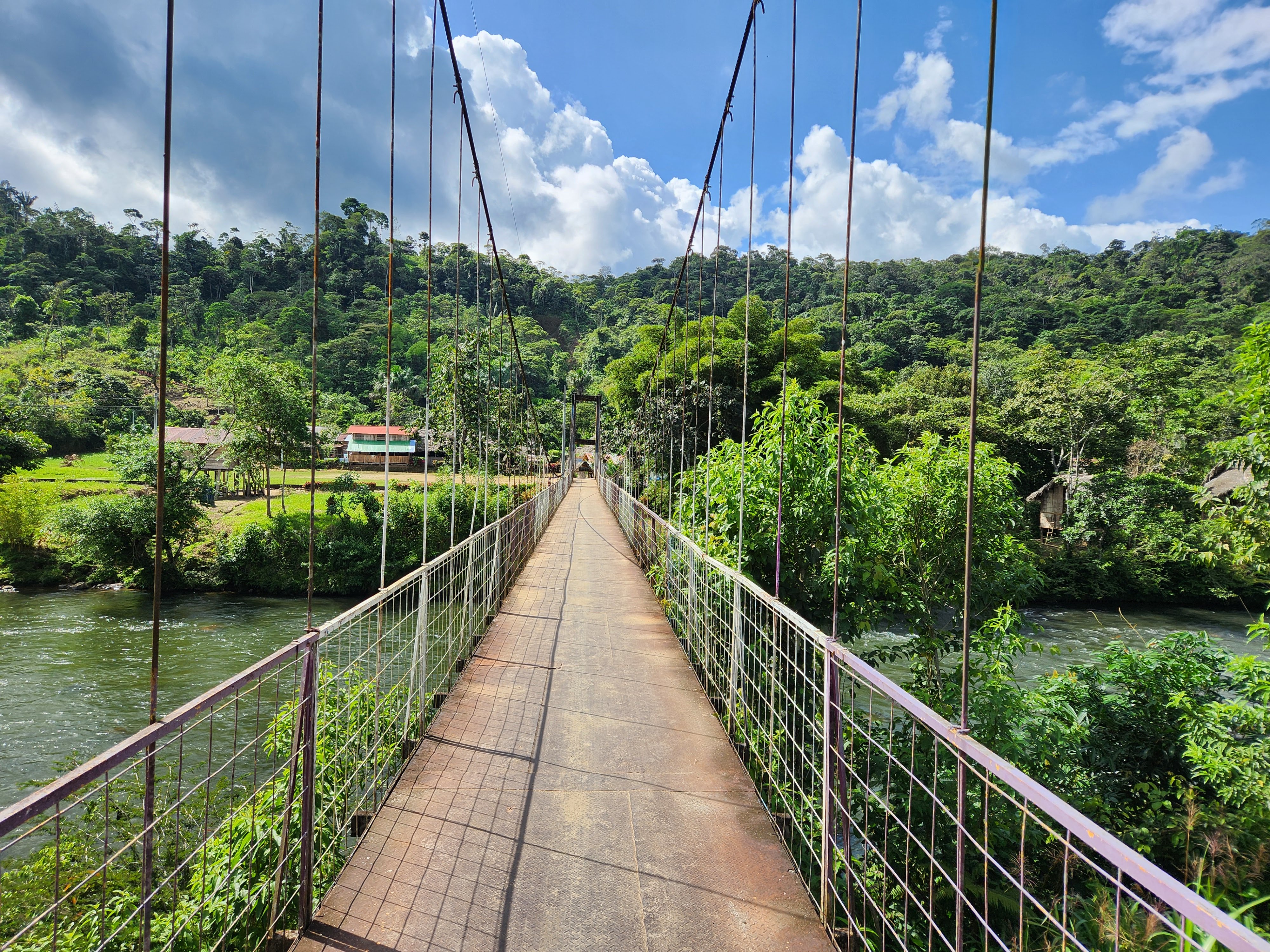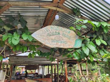 We hung out on the bungalow porch and took in the views. Our bungalow was perched on the edge of the Puyo river which was shrouded in a dramatic layer of fog this morning. As the sun rose higher, the fog burned off and we were treated to stunning views of the riverbanks around us. We rendezvoused with Carlos at 8 AM and headed off to the local cacao farm, El Paraiso Cacao Farm, to see how chocolate is produced.