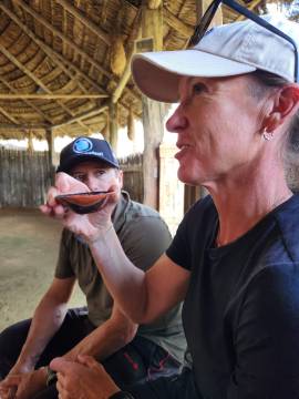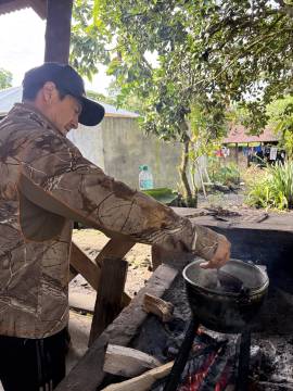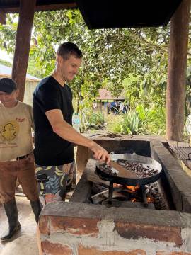 Carlos walked us over to a fire on a stove that was being tended by the orchard owner. The orchard owner handed Scott a wooden spoon and instructed him to stir the cacao beans around the pan. Once roasted, they were removed from the heat, and we were then shown how to crack them and remove their outer covering and to save the interior portion. At this point they closely resembled, as well as smelled like, coffee beans. At this stage these were considered “cacao nibs.” We were told to sample them and I already knew I would not be a fan since I am not a huge chocolate lover and certainly do not appreciate dark or bitter chocolate.