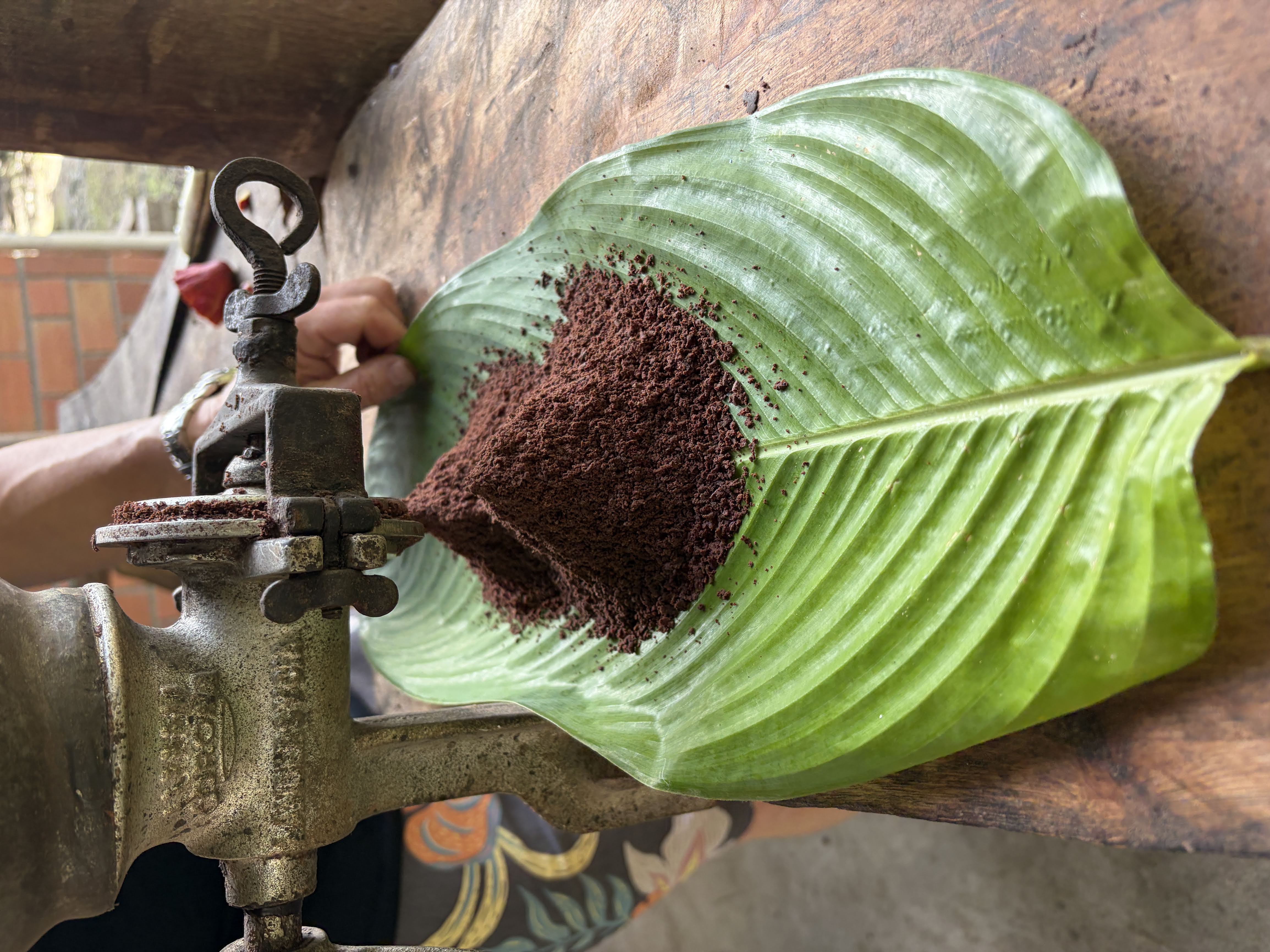 The next step was to put the nibs in a hand-cranked grinder and Scott was shown how to grind them down. The powder was collected in a banana leaf and was then processed through the grinder two more times. At this point it was ready to either be briefly frozen so that it formed a patty of sorts, or could be added to hot milk with some cinnamon to make Ecuadorian hot chocolate. Half of the powder was put in the freezer on the banana leaf, and Carlos took the other half to make the hot drink for us. He had snapped a twig off a cinnamon tree in the orchard and then used a knife to scrape off some of the bark into the saucepan as he stirred the cocoa powder into the hot milk.