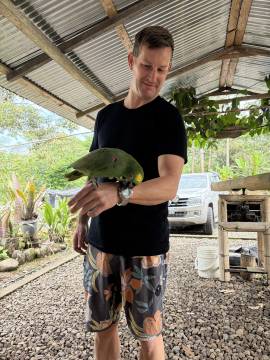 As breakfast was wrapping up we heard squawking from the trees nearby and saw a trio of green parrots. They were actually pets. We wandered over to look at them and one of them, Pepe, became instantly fixated on Scott’s shiny divewatch. His body language conveyed his desire to be lifted off his perch so that he could get a better view of the watch. He parked himself on Scott’s arm and proceeded to gnaw, peck, and pry at the watch. He was absolutely obsessed with it and refused to go back on his perch, biting Scott every time he attempted to get him to hop back up on it. Scott eventually freed himself of Pepe who continued to stalk him wanting another go at the watch. It was pretty funny to observe!