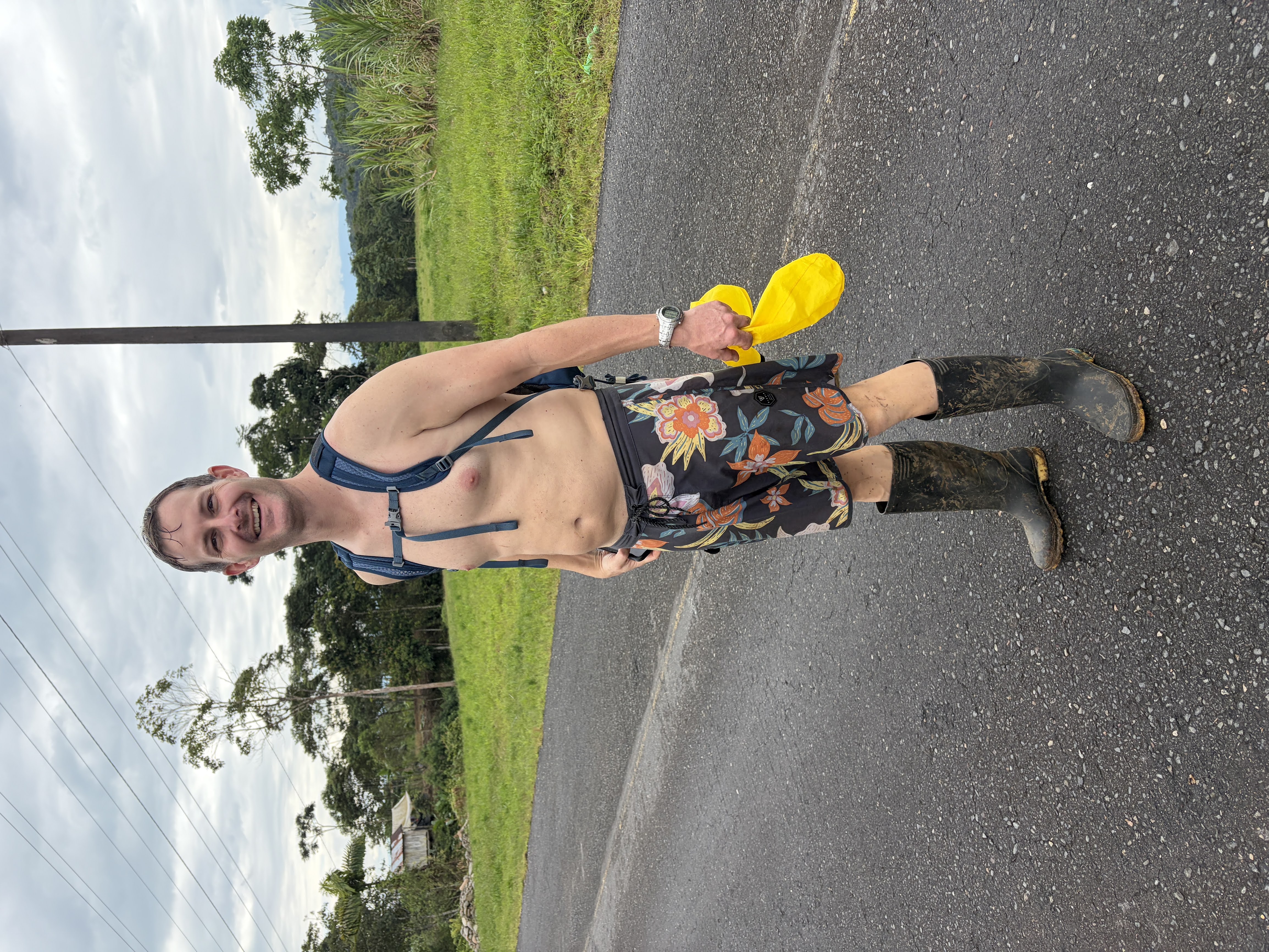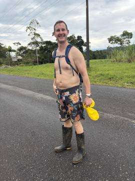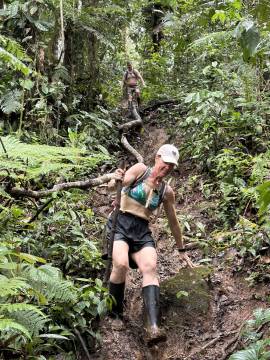 It had started to rain at this point and Carlos wanted us to get out of the canyon as quickly as possible because the water can rise fast with rain upstream. So we hustled out, grabbed our clothes and started the hike back out. We took a different route that was mostly downhill, and while it required less machete action, was even muddier than the hike in. He gave me a walking stick which was helpful but I still managed to have one wipeout which covered my whole backside with mud.