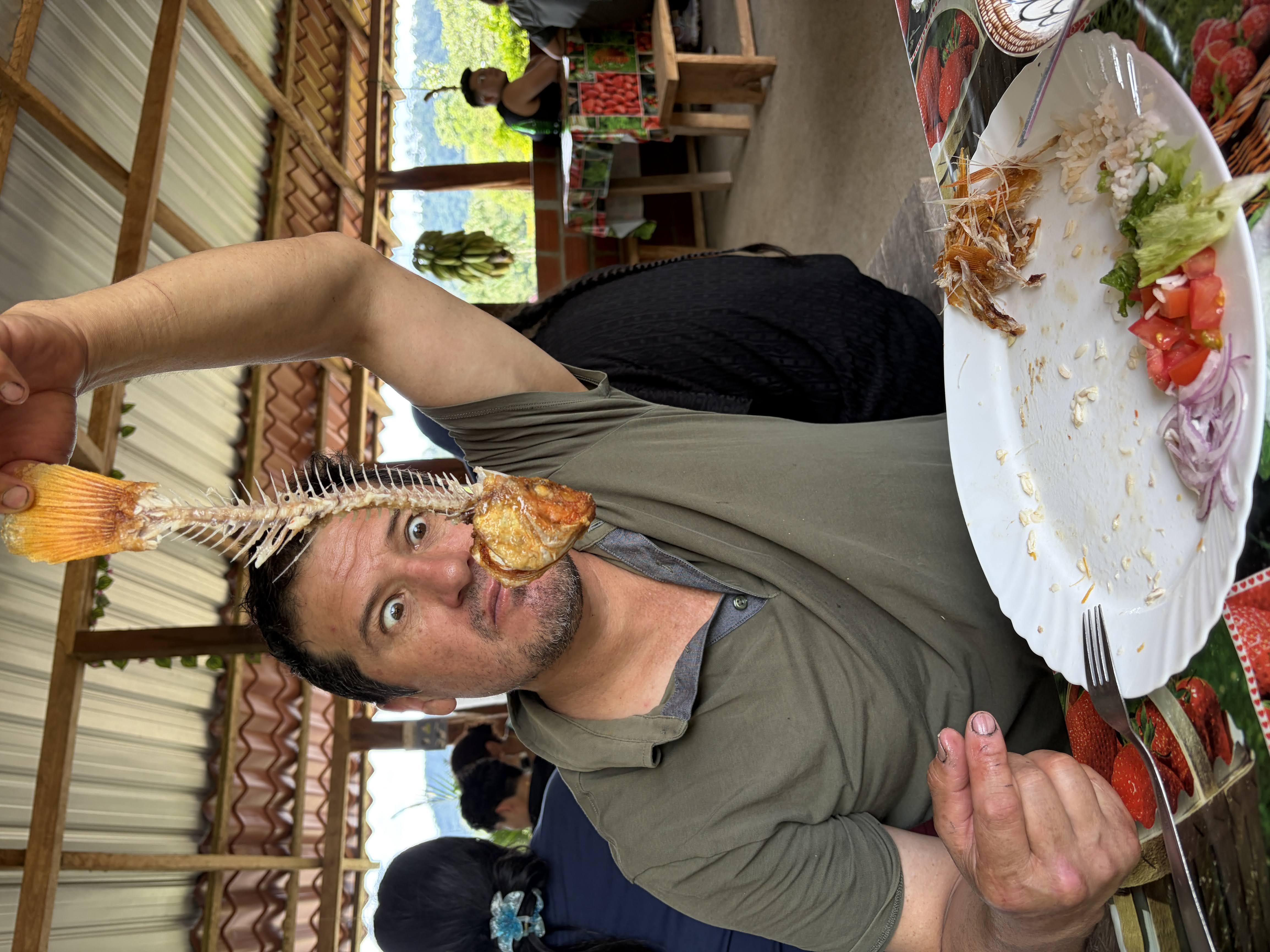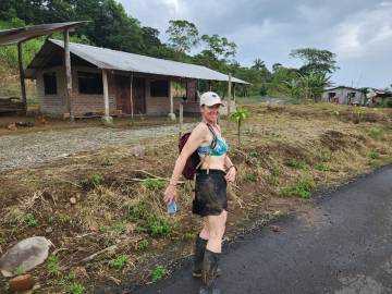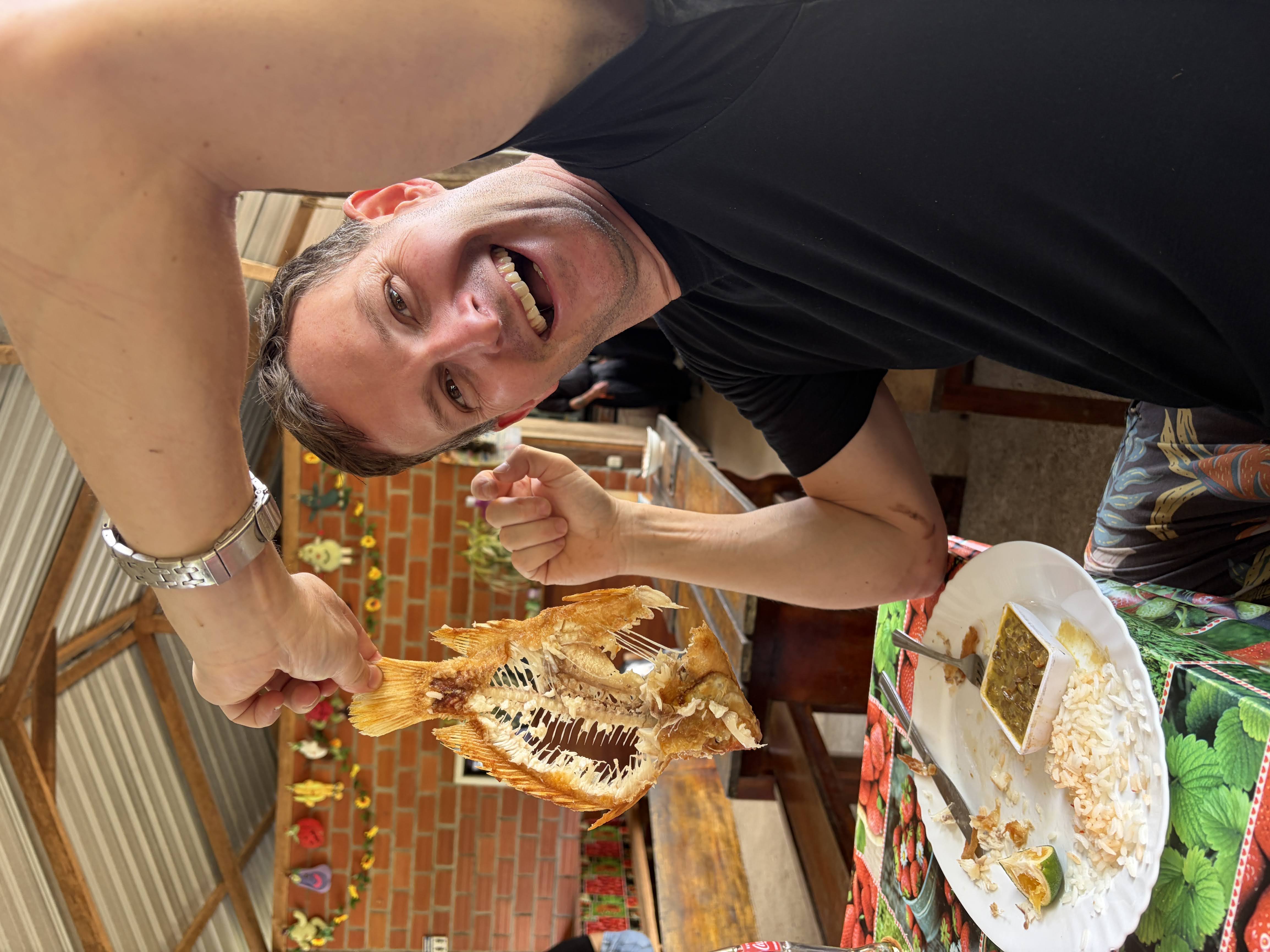 We eventually reached the road and walked on it a ways, laughing at what we must look like- clad in rubber boots and swimsuits and covered in mud. Eventually we reached the same restaurant where we’d eaten our other meals. Carlos told us to hang out while he went to get the truck. We cleaned up as best we could and waited on him and for our lunch to be ready. Carlos eventually returned and we had lunch. Scott had tilapia again (fried) and I was finally hungry again and had chicken.