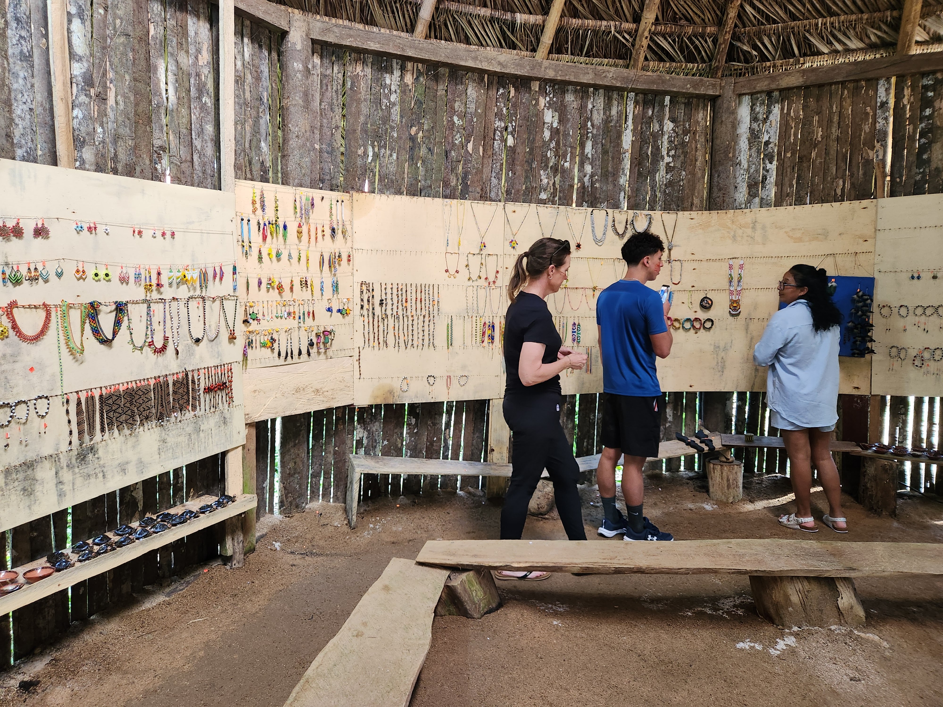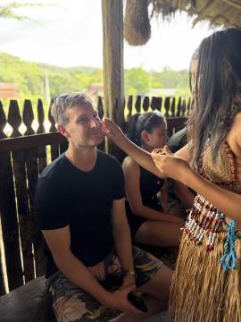 We declined the offer to eat the fat, wriggling and writhing chontacuro grubs that were offered to us next, but did partake in the traditional face painting. Evidently Scott’s pattern was meant to protect him if he were to head off into battle and I missed hearing what my pattern meant. We were offered the chance to hold a macaw and a monkey (Scott pet the monkey which made me mad because I object to them being bred for pets and I warned him that they bite, and if bitten he would have to have post-Rabies exposure treatment but he did it anyways) and then got hustled for donations and then were sent to the gift shop. I did buy a cute beaded bracelet.