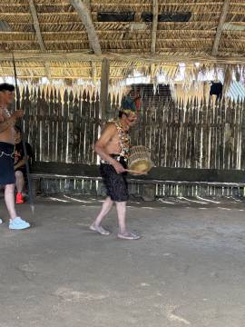 The last phase of our Amazon experience was a trip to visit the village of an indigenous community, the Amazonian Kichwas. No offense to the Kichwas, but the experience felt much like visiting the Oconoluftee indian village in Cherokee, NC. A little contrived. There was a song and dance exhibition where their village grandpa was told to go out and bang his drum for a bit and march around the thatched roof hut for the tourists, followed by a girl that made the rounds passing out community hooch, or chicha from a wooden bucket.