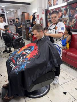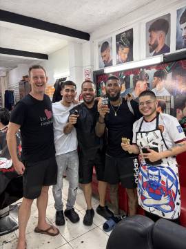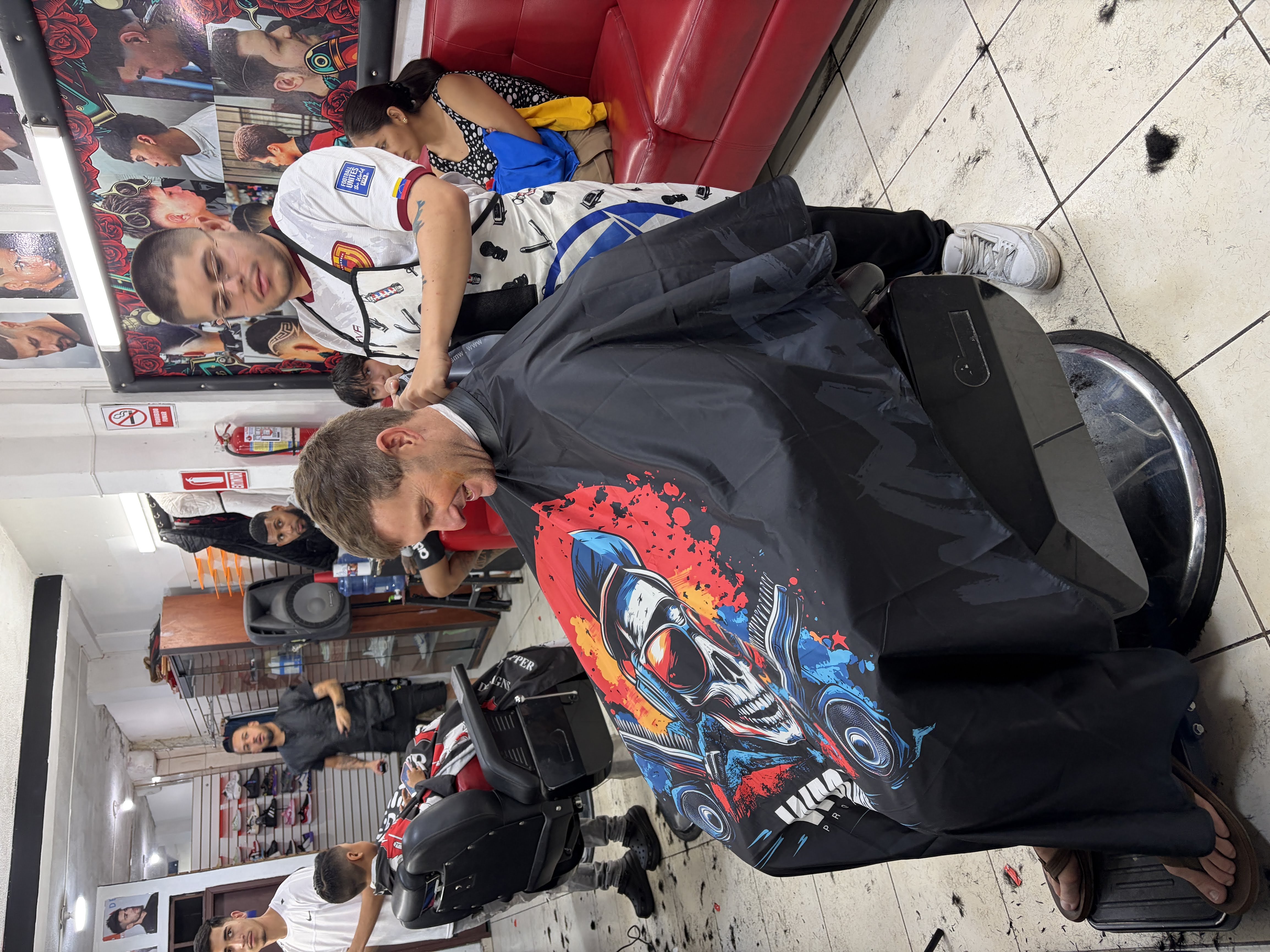 We had joked earlier in the trip that Scott should get a haircut like he had done in Thailand, and the universe served up the perfect opportunity this evening. As we were headed back to our hotel we passed a barbershop that more closely resembled a rave than a hair cutting establishment and they summoned Scott in enthusiastically when he asked how long the wait was. We enjoyed the party-like atmosphere and he got the best daggum haircut of his life, and everyone posed for a photo op at the end.