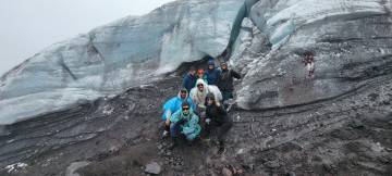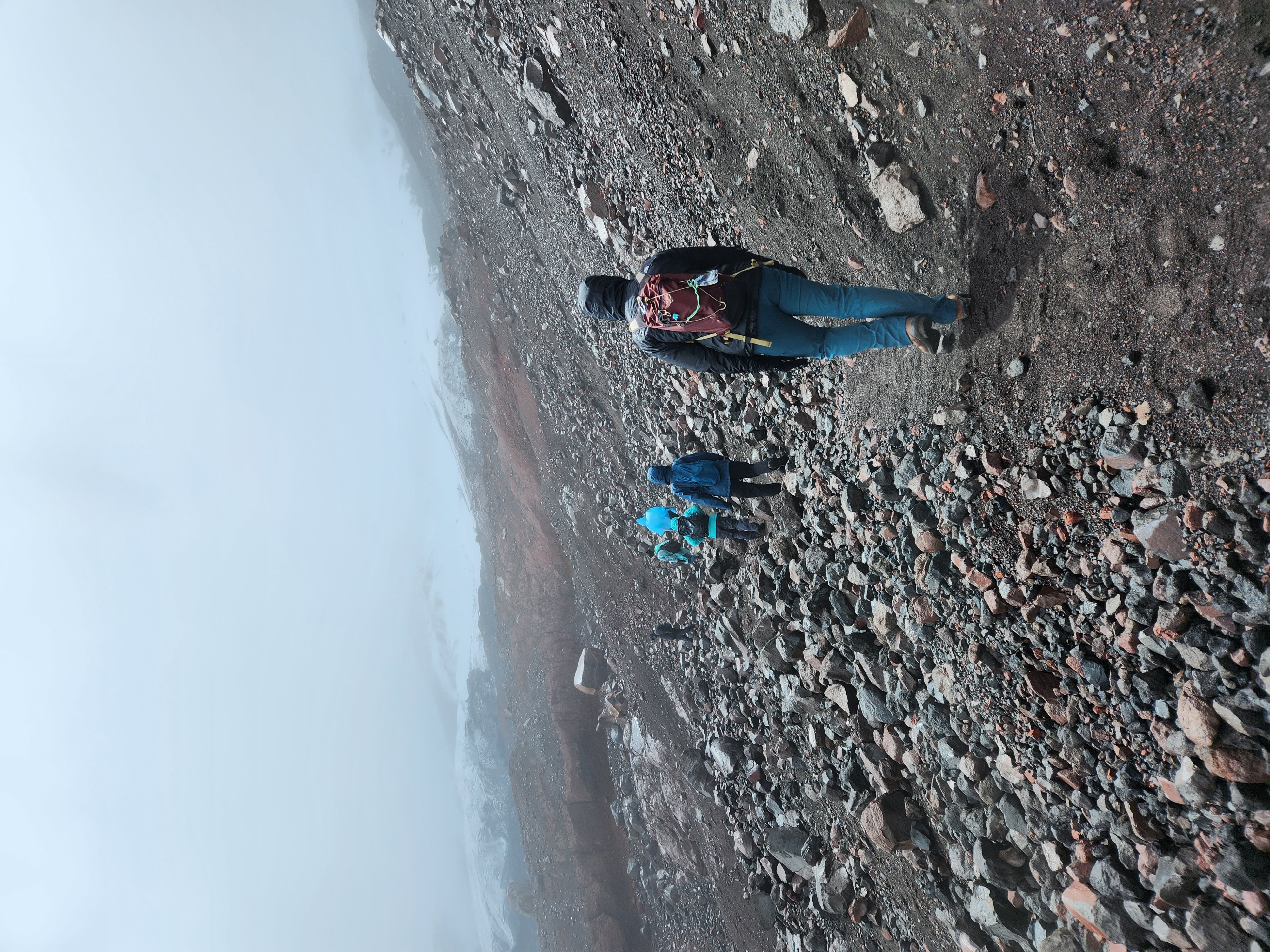 The base camp to glacier leg was pretty intense because the footing changed. It was more hard- packed but with loose rocks over top that caused your feet to slide out unexpectedly from underneath you. There also was a little bit of rock scrambling that we had to do. I also learned something. I knew that mountain climbers strike out early on their hikes, and I never really thought about why that was until I got to experience it firsthand on this hike. It is because the sun’s light causes glacier melt and causes little streams and creeks to appear so the going gets sloppier and potentially more dangerous as the day goes on. (It also makes snow bridges more likely to collapse as the day gets warmer, although that didn’t apply to us.)