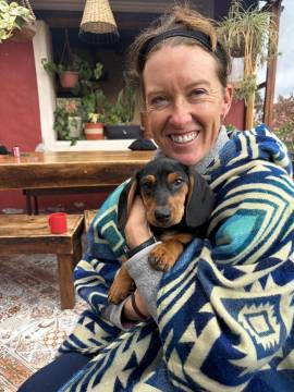 We showered, donned our complimentary ponchos, then parked ourselves on the loveseat near the fire. Just when I thought life couldn’t get any better, the invasion of the wiener dogs happened. The SGC owners had two Dachshund puppies and they jumped through the doggy door in front of us and came bombing into the building chasing each other. I was able to scoop up the male and have a brief snuggle with him before he wanted to be let down to keep chasing his sister.